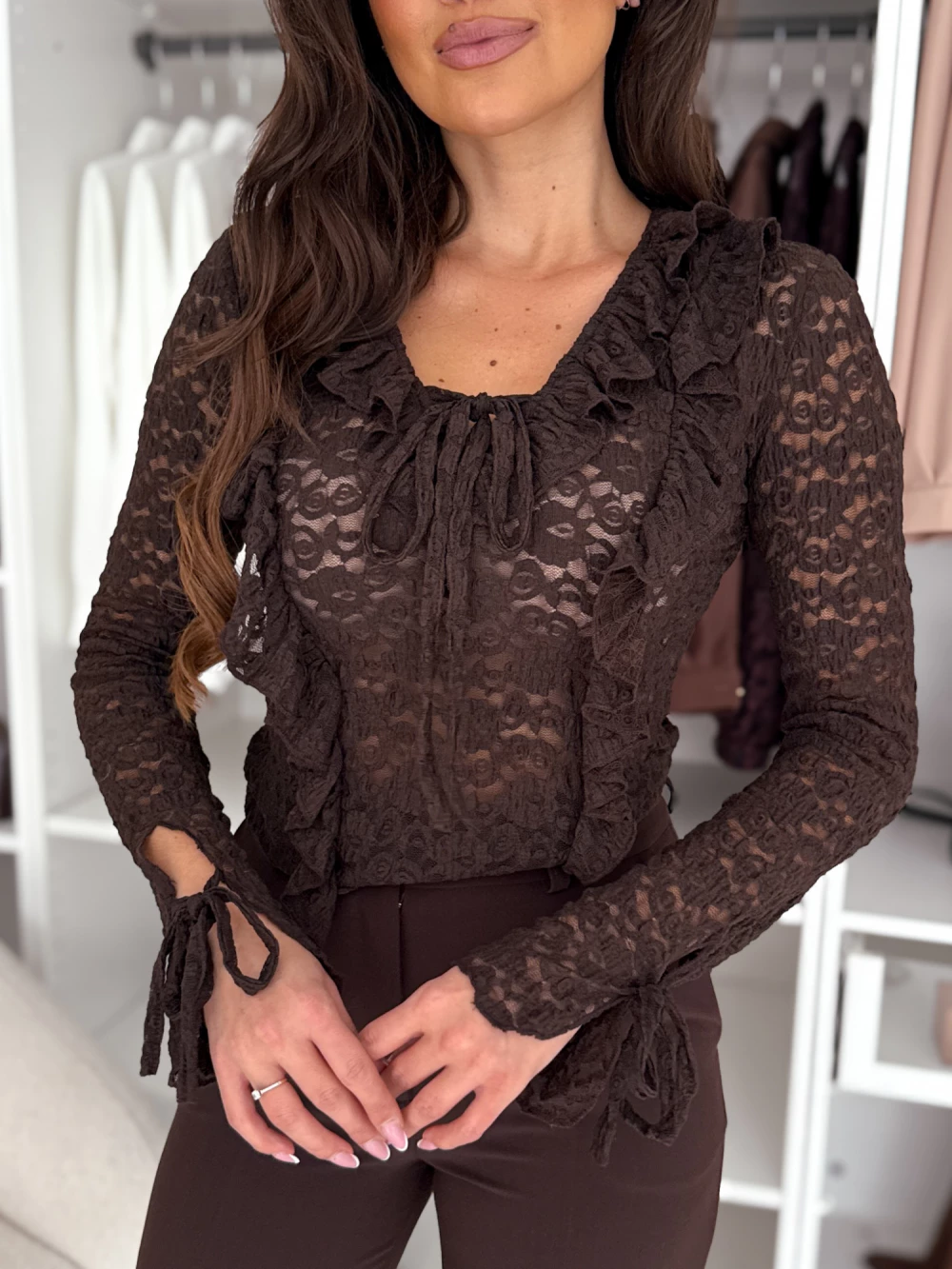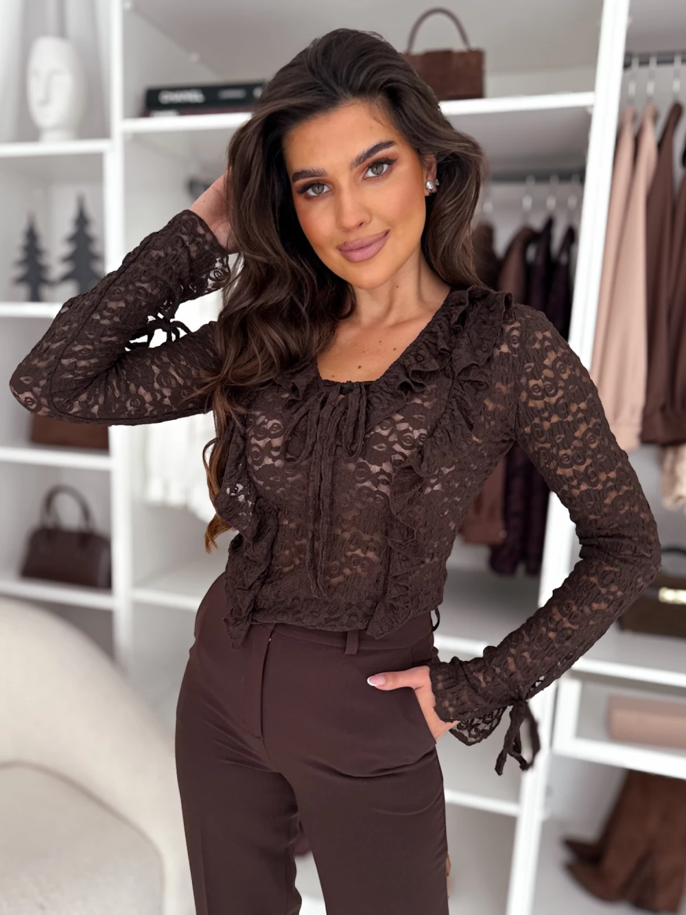 Bluzka koronkowa z ozdobnym dekoltem czekoladowa Dalia
