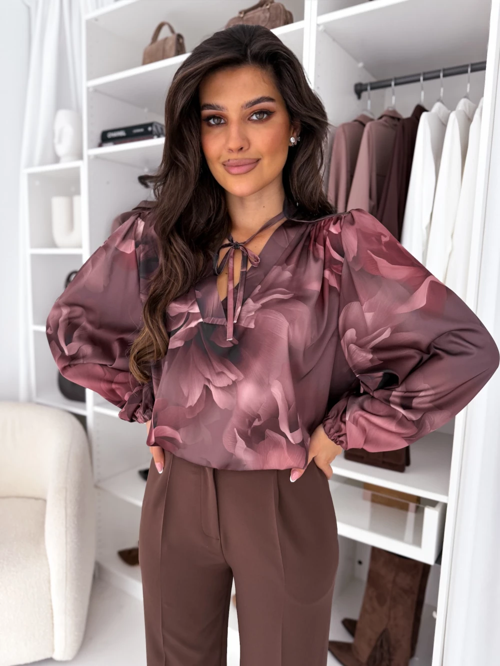 Bluzka z wiązaniem pod szyją w czekoladowe kwiaty Viva