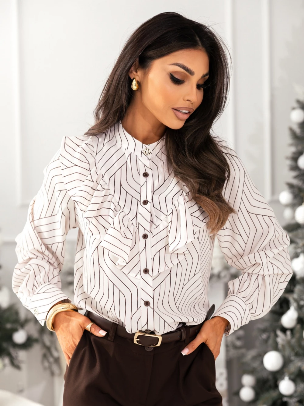 Bluzka zapinana na guziki z żabotem Ariana beżowa wavy line