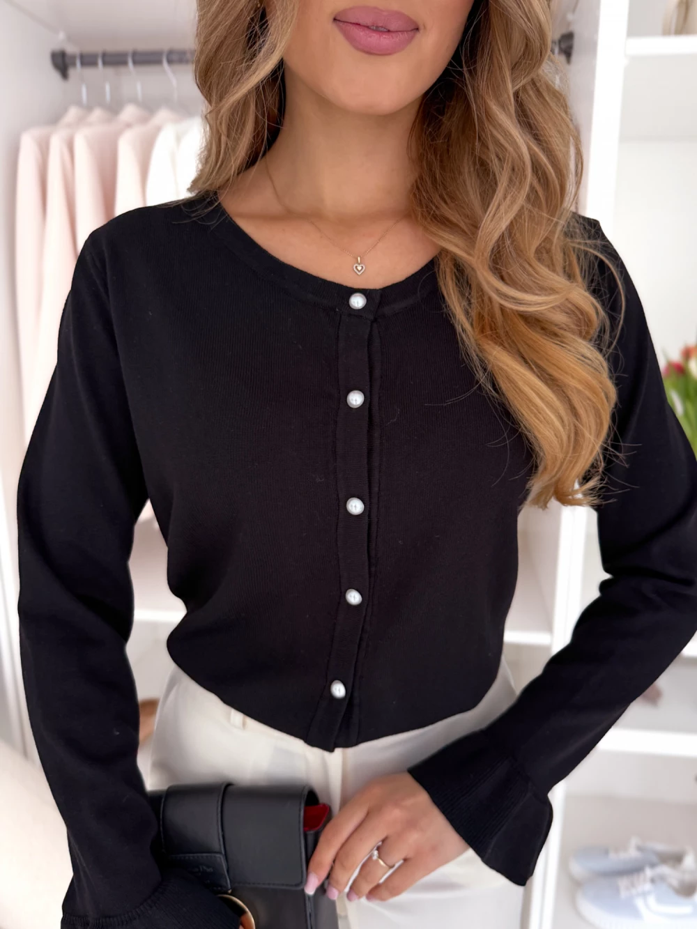 Klasyczny sweter-kardigan Silva z biżuteryjnym akcentem i falbanką czarny