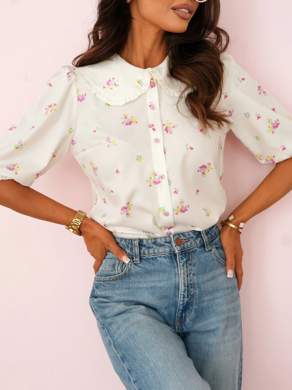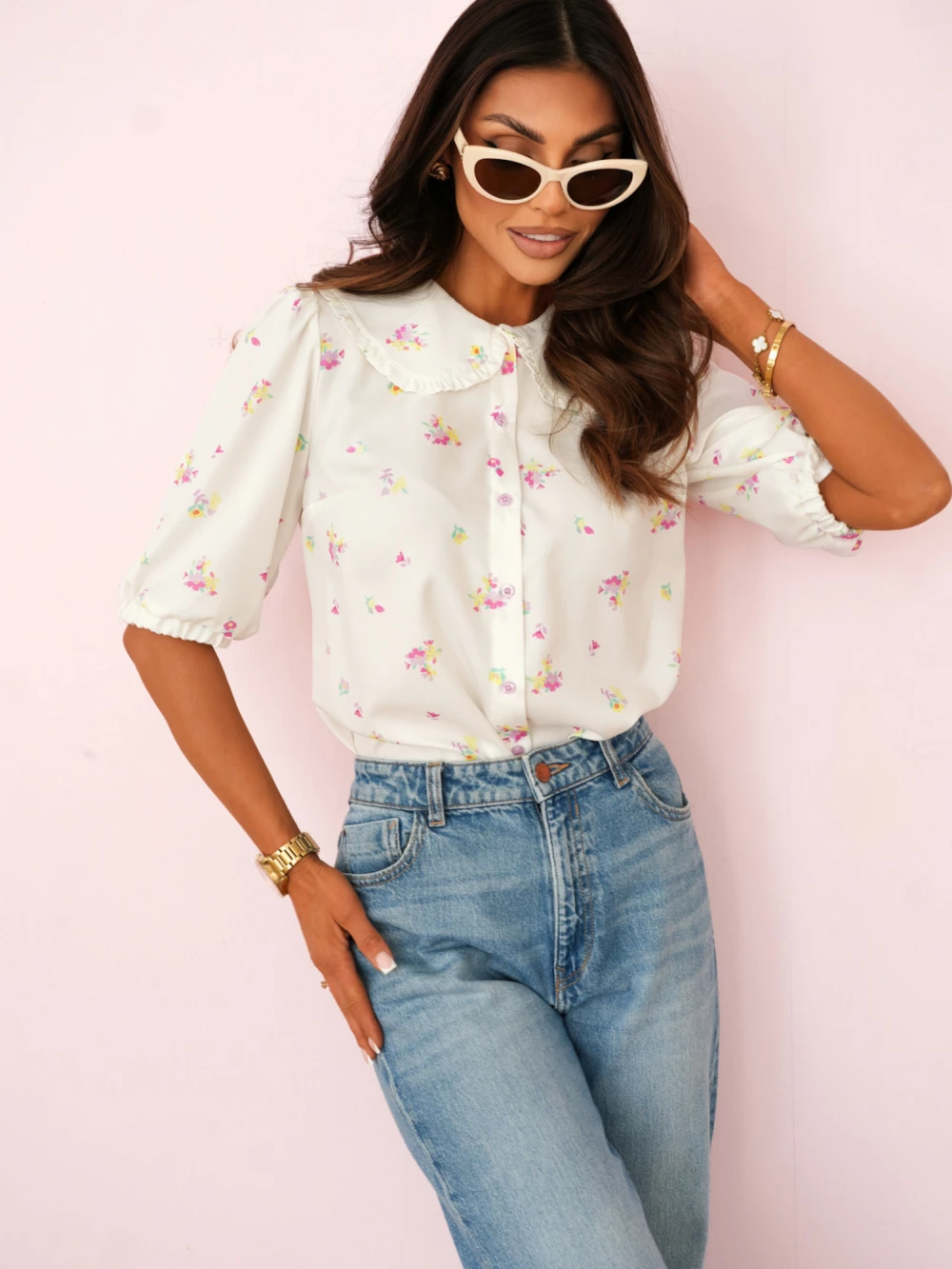 Koszula z kołnierzem retro i bufkami Alice śmietankowa w różowo-żółte kwiatki