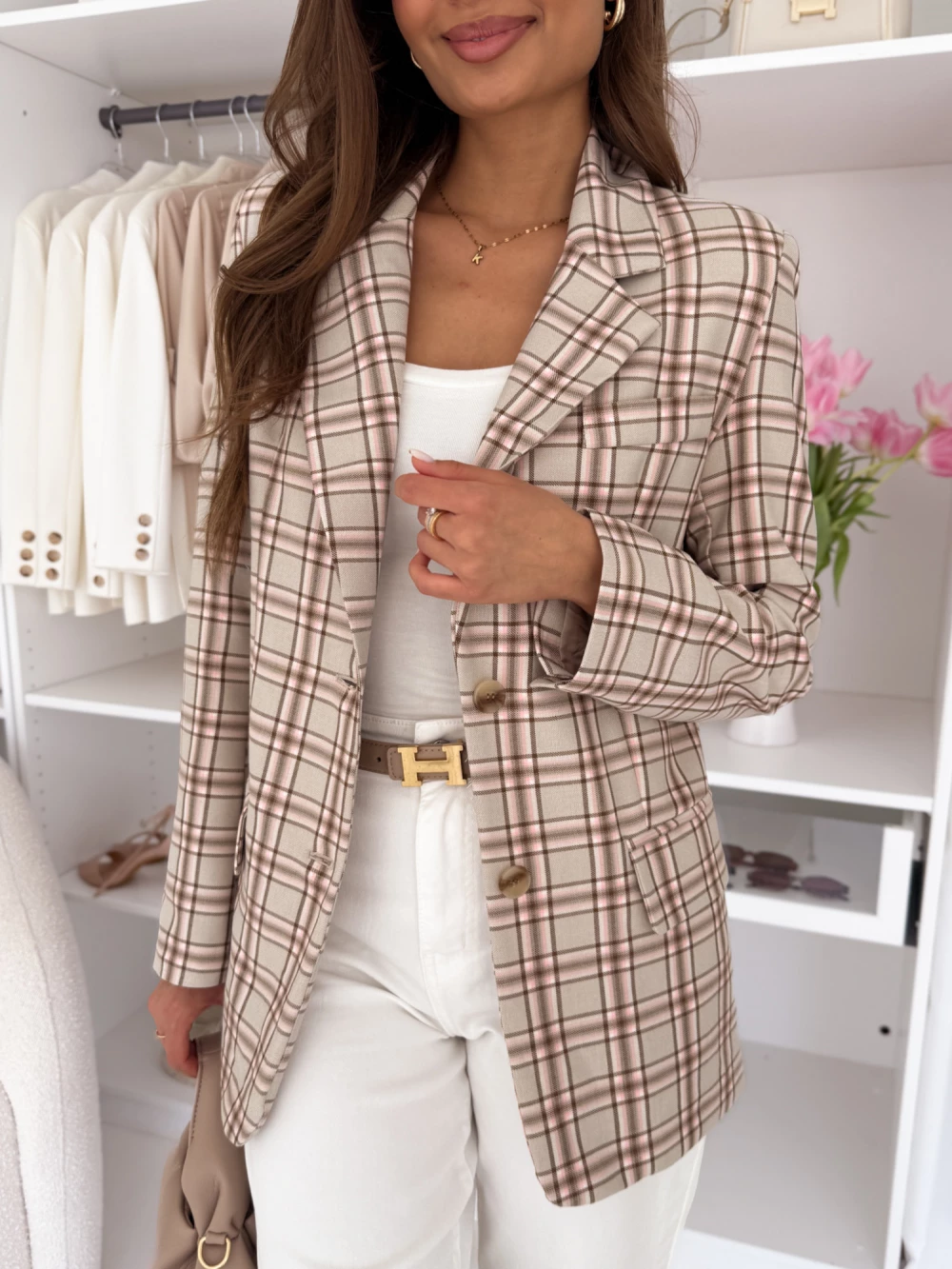 Marynarka na dwa guziczki beżowa w pudrową kratkę Vintage