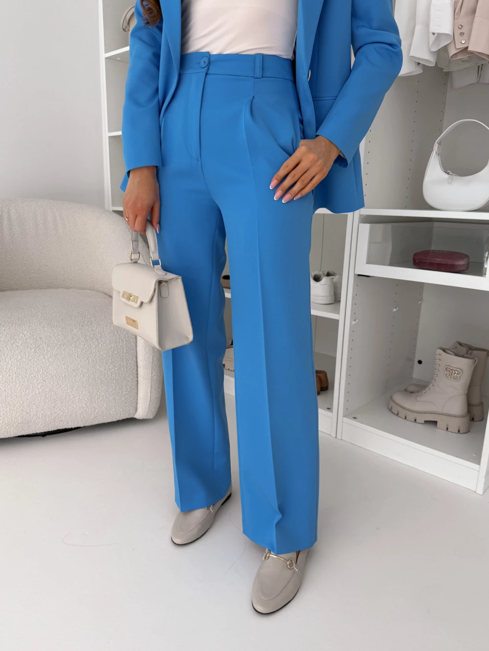 Spodnie polskiej produkcji z wysokogatunkowej tkaniny. Spodnie rozmiarowe o prostym kroju z kieszeniami i podwyższonym stanem. Pasek ze zdjęcia jest jedynie elementem stylizacji.