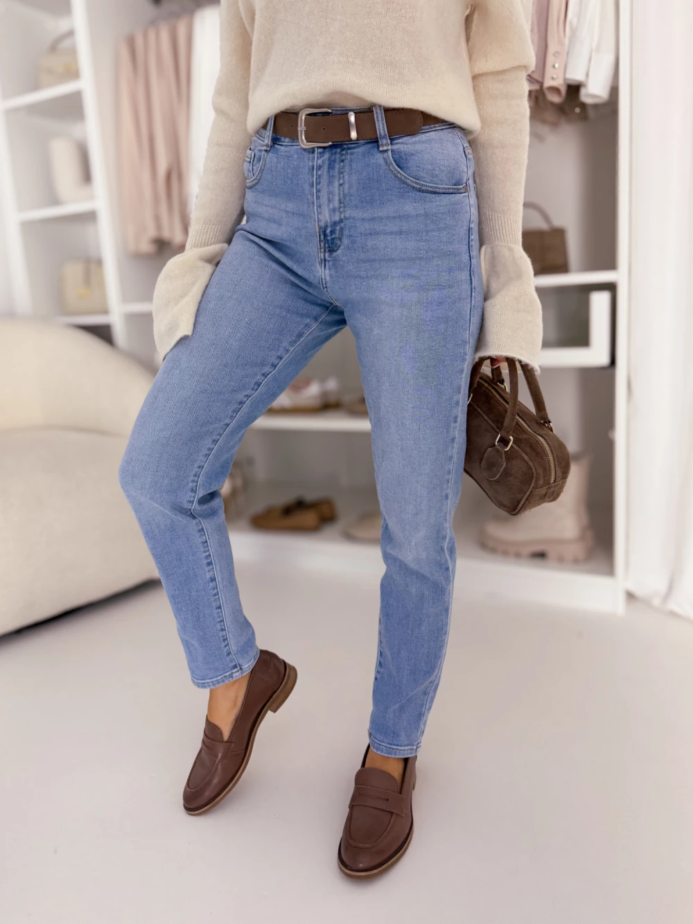 Spodnie Mom Fit blue jeans z ozdobnym paskiem Clara