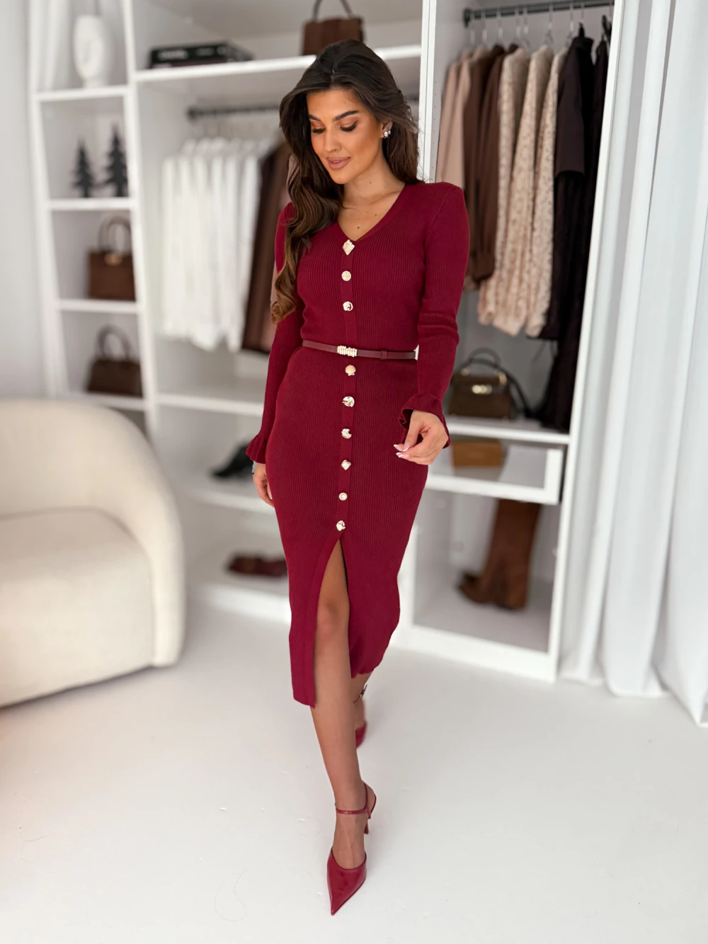 Sukienka dzianinowa z ozdobnym paskiem i guzikami bordowa Bueno
