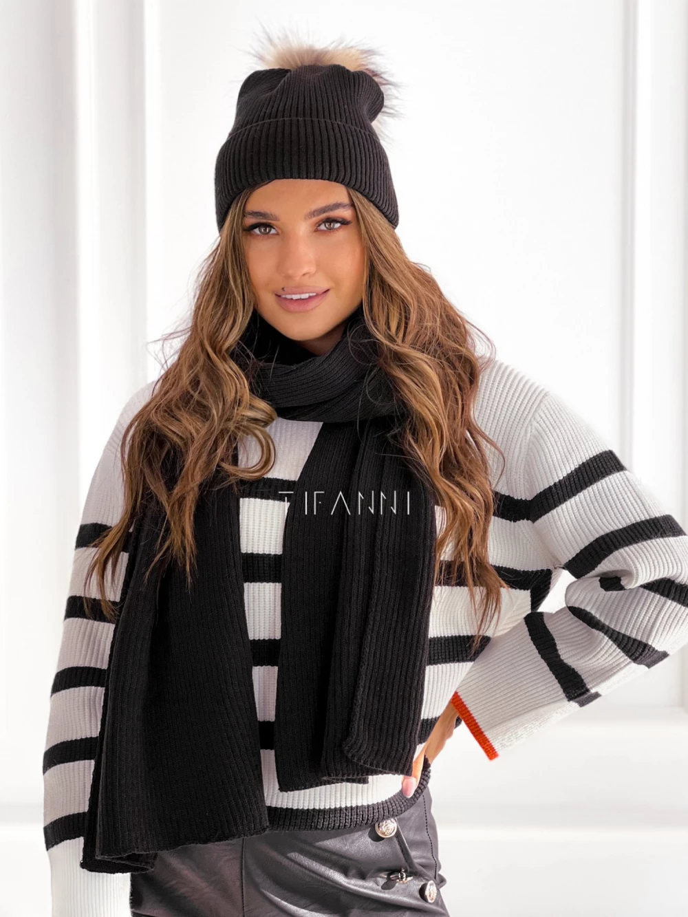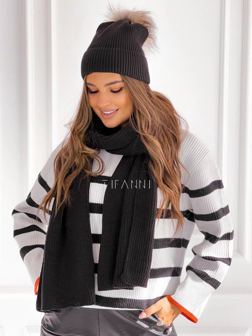 Komplet czapka z pomponem i szal Vivi czarny #uszytewpolsce
